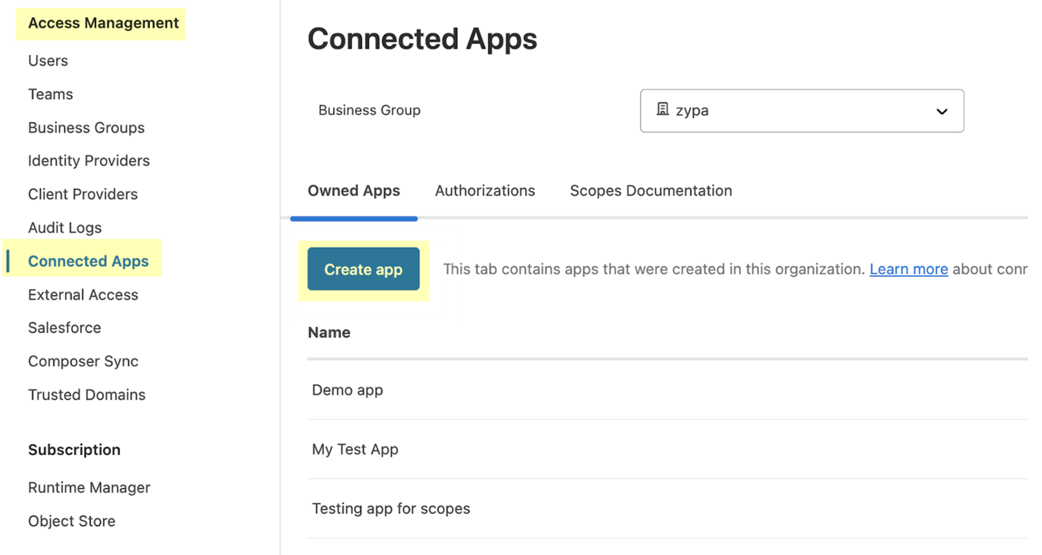 - Open a web browser to the MuleSoft Anypoint Platform login page and log in to the Organization Administrator account that you identified earlier.From the Anypoint Platform home screen, navigate to the Access Management page. How you navigate to the Access Management page can depend on your interface version. In some interface versions, a link to the Access Management page is on the home screen. If you do not see a link on the home screen, you can locate the Access Management link under the main navigation menu in the top-left corner of the Anypoint Platform page.From the left navigation pane of the Access Management page, select Connected Apps.On the Connected Apps page, click Create app.