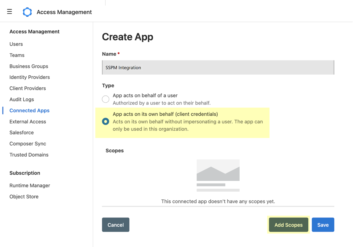 - Identify the Anypoint Platform account that you will use to create your Connected App.Required Permissions: To create the Connected App, you must use an Anypoint Platform account that is assigned to the Organization Administrator role.Create your Connected App.SSPM will use this Connected App to authenticate to an Anypoint Platform API to run scans. You will configure the Connected App to allow access to only the scopes that SSPM requires for its scans.