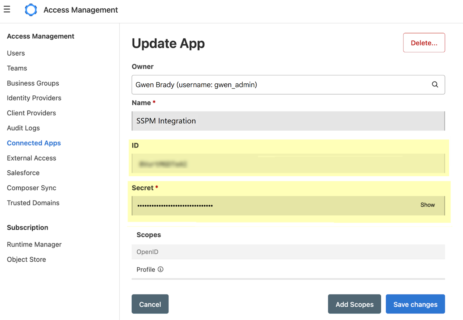 The Anypoint Platform creates the Connected App, which it displays in the list of Connected Apps on the Connected Apps page.From the list on the Connected Apps page, click the name of your Connected App.The Anypoint Platform displays the Update App page, which shows details about your Connected App. The details include the Connected App credentials (Client ID and Client Secret), which SSPM will use to authenticate to an Anypoint Platform API to run scans.