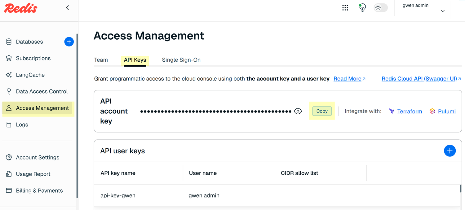 - Identify the Redis Labs user who will use to get the API account key and API user key.Required Permissions: The user must be assigned to the Owner role in Redis Labs. This Owner role is required to enable the Redis Cloud REST API and to create an API user key.Open a web browser to the Redis Labs login page and log in as the Owner that you identified in the preceding step.Locate and copy your API account key.Redis Labs generates a unique API account key the first time a Redis Labs account Owner enables the REST API. This API account key appears on the Access Management page in Redis Labs.