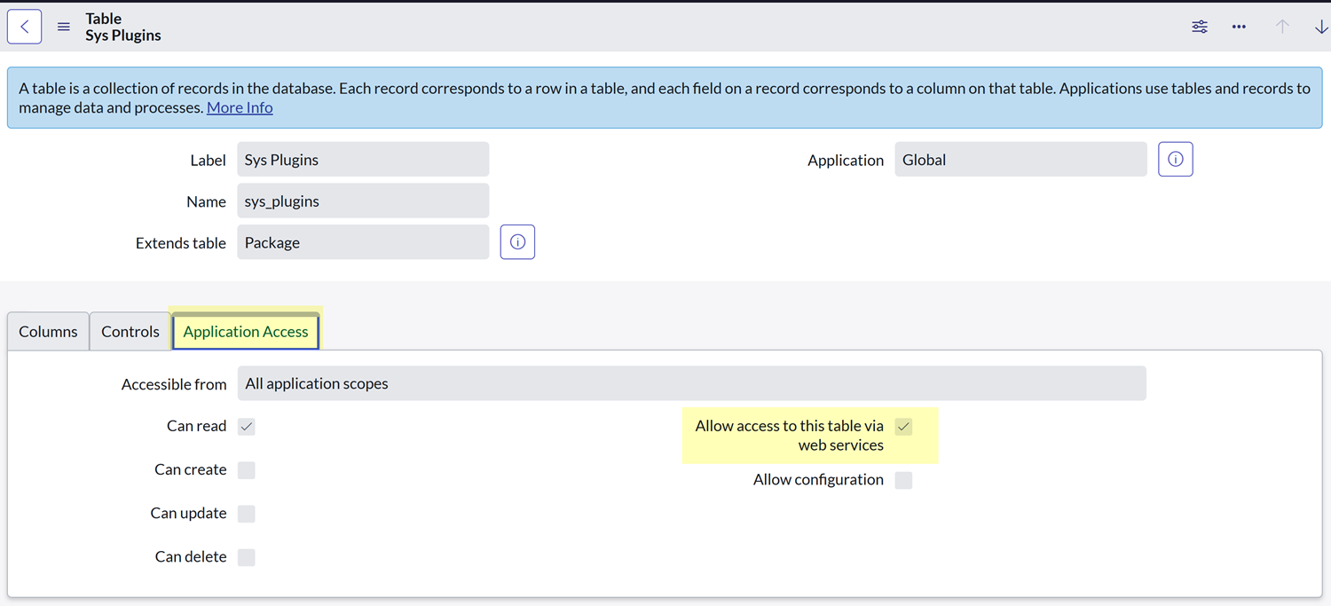 - In the table record, verify that the Allow access to this table via web services checkbox is selected. If necessary, select the Allow access to this table via web services checkbox and click Update to save your changes.
