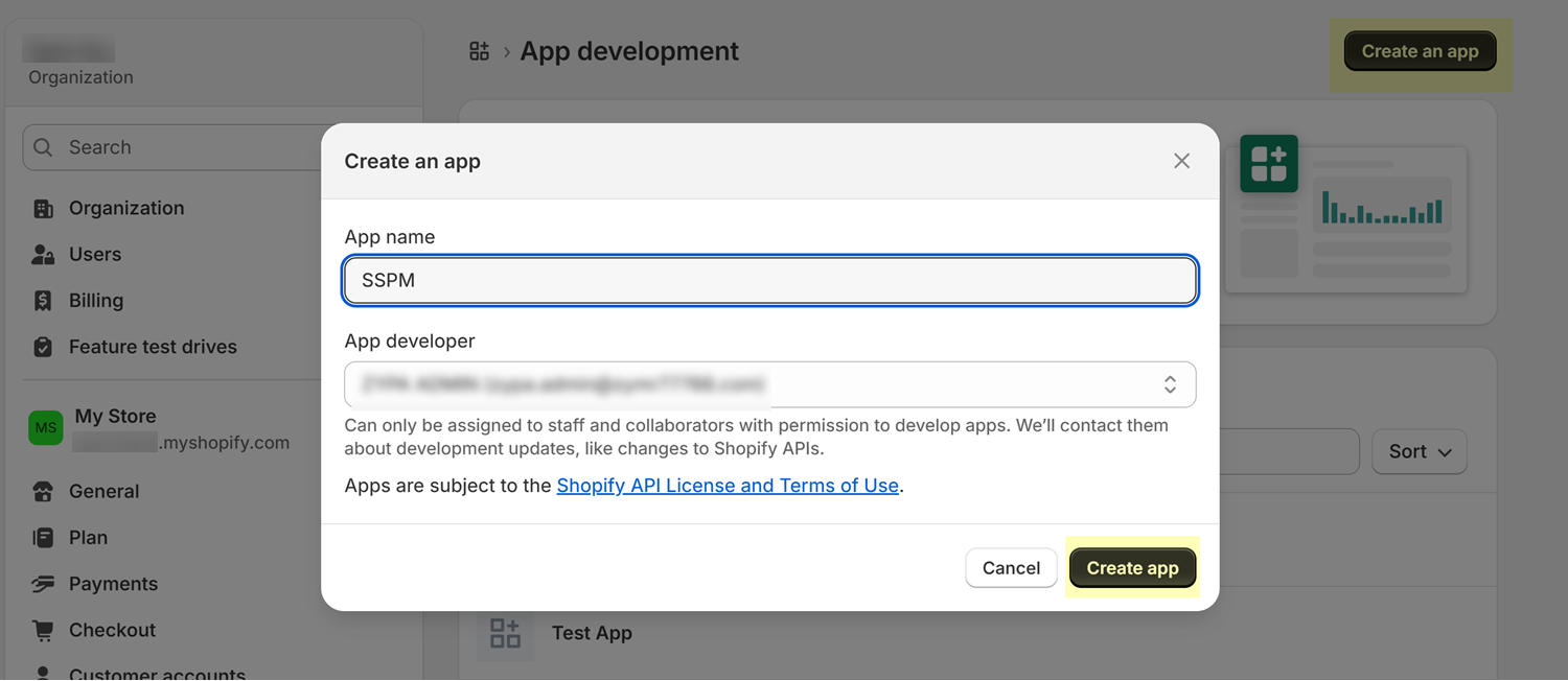 On the App development page, click Create app.In the Create an app dialog, specify a name for your app and Create app.