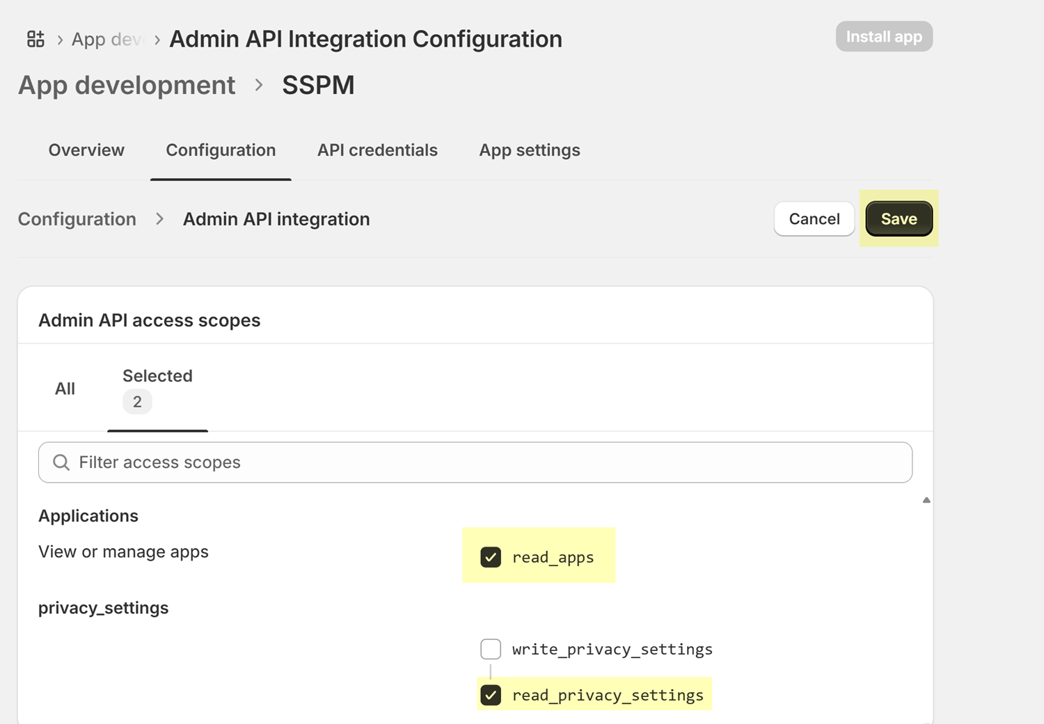 Shopify displays a tabbed configuration page for your new app.On the Configuration tab for your app, complete the following steps to identify the API scopes that SSPM will be able to access:- Configure the Admin API Integration settings.