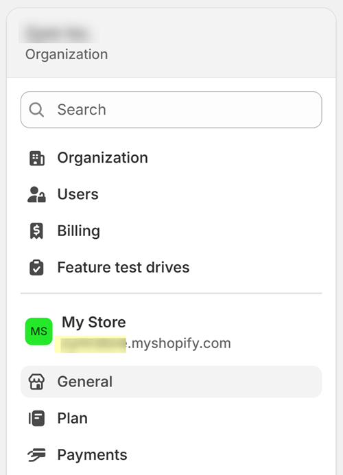 Identify your store name.Your store name is the subdomain of the URL that Shopify assigned to the store when you created the store. The default URL has the format <store-name>.myshopify.com.- Navigate to your store settings. To navigate to your store settings, click Settings in the lower-left corner of the page.From the left navigation pane of the settings page, locate your store name in the default URL for your store.The default URL has the format <store-name>.myshopify.com.