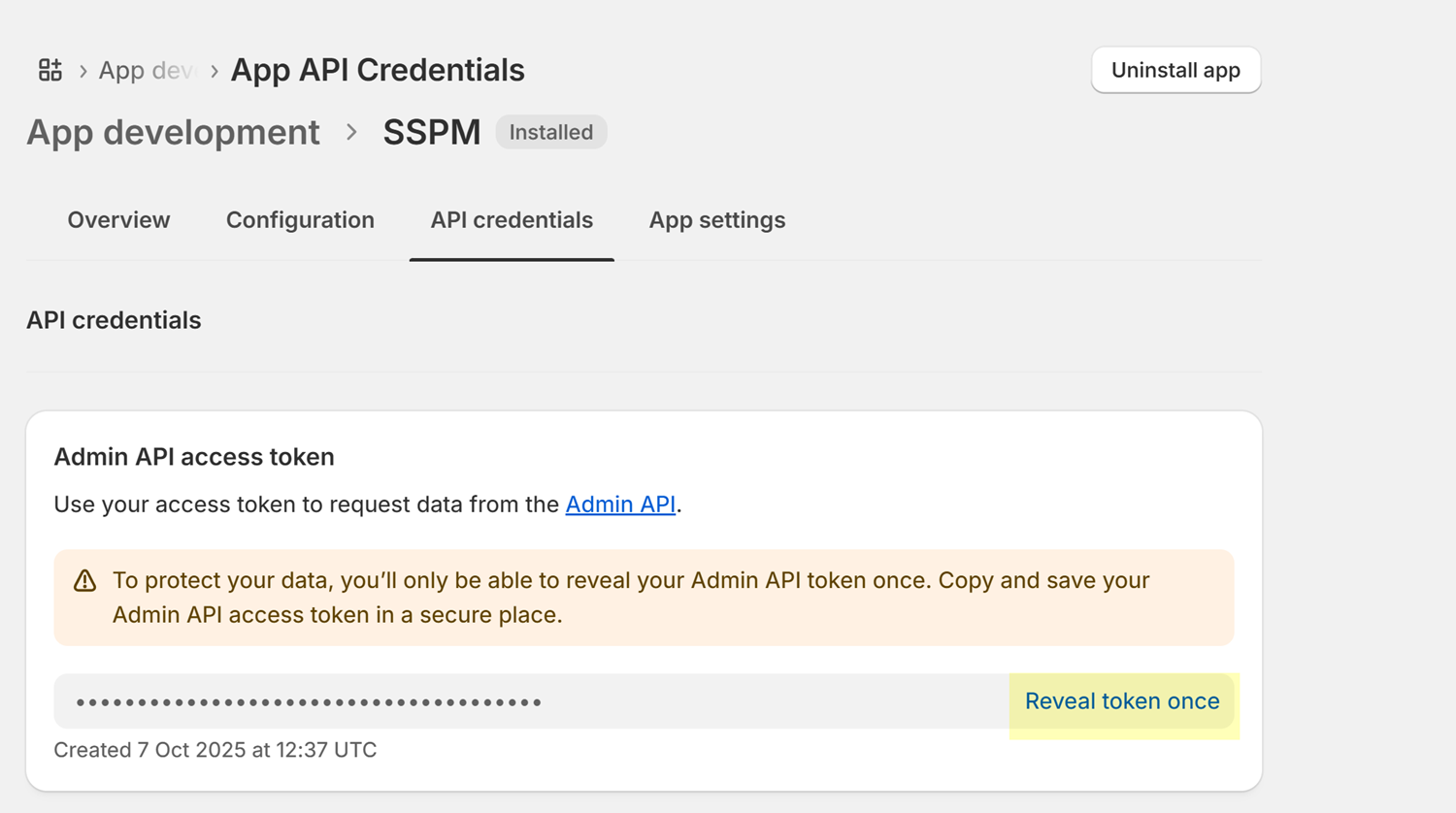 On the API credentials tab for your app, click Reveal token once to display the API token for your app.Copy the API token and paste it into a text file.Don’t continue to the next step unless you have copied the API token. You must provide this API token to SSPM during the onboarding process.
