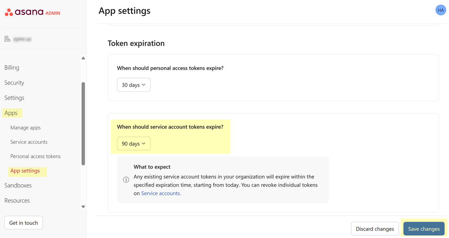 By default, the lifespan for service account tokens in Asana is 10 years. To limit the attack window should the token become compromised, we recommend that you specify that service account tokens should expire after 90 days.