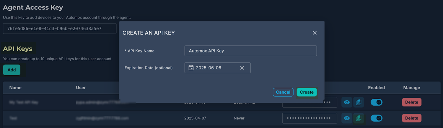 On the Secrets & Keys page, scroll to the API Keys section and Add a new key.Fill out the fields of the Create an API Key dialog and Create the key.Automox adds the new key to the list of API keys.