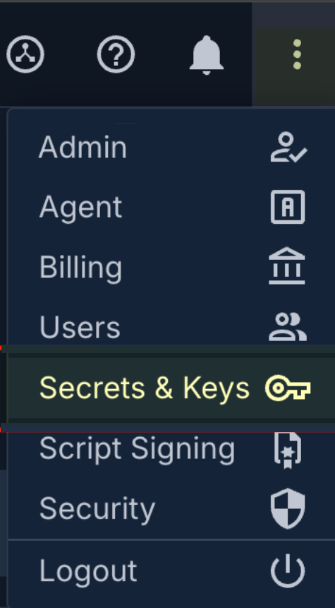 Using the credentials of the account you identified, log in to the Automox console.Locate the settings menu icon in the upper right corner of the console. The settings menu icon is a vertical ellipsis (three dots). Click the settings icon and select Secrets & Keys.