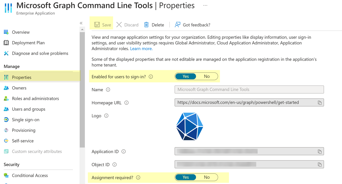 Connect-MgGraph -Scope "Sites.Read.All","Domain.Read.All","openid","profile","ReportSettings.Read.All","OrgSettings-AppsAndServices.Read.All","OrgSettings-DynamicsVoice.Read.All","OrgSettings-Forms.Read.All","Application.Read.All";After you issue the preceding commands, the Enterprise applications page will list the Microsoft Graph Command Line Tools.Click the application name and, from the left navigation pane, navigate to its Properties.Set the Enabled for users to sign-in property and the Assignment required property to Yes.Save your changes.