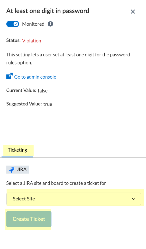 Create the ticket.SSPM creates a ticket for this violation. The ticket contains details about this violation, such as the current and recommended values for the setting.View a Ticket Associated With a Rule Violation