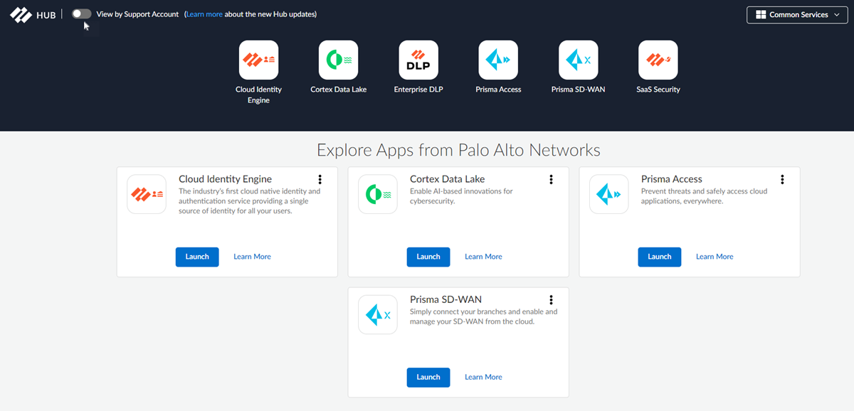 If you are an existing customer prior to August 2022, you have received information about the transition of your apps and add-ons to the Strata Cloud Manager. After your apps and add-ons are transitioned, you will no longer see the app tiles on the hub. However, there will be a toggle to a new tenant view of the hub. After the transition, you can use the tenant view of the hub to launch your products. If you’re a new customer as of August 2022, you see the tenant view of the hub by default.- Go to the hub and log in.Use the toggle to view your transitioned apps in the tenant view of the hub.