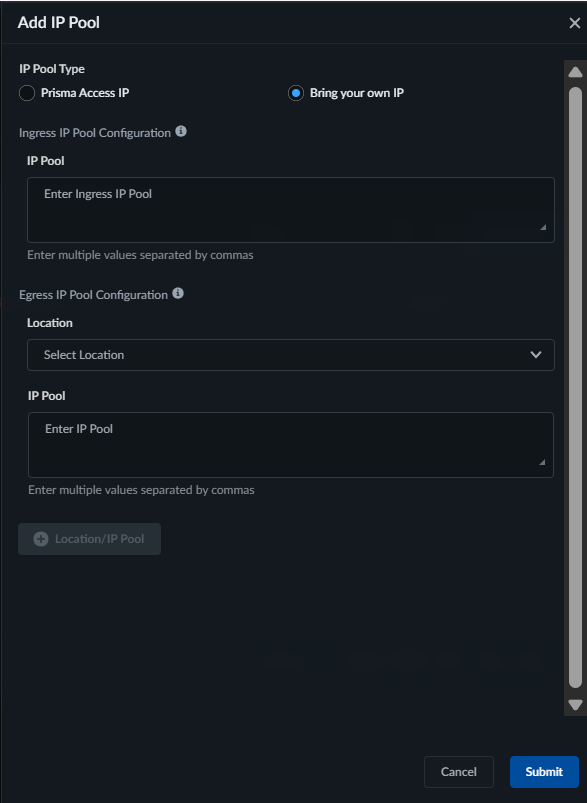 - Bring Your Own IP: Select this option to configure the Ingress and Egress IP Pool.