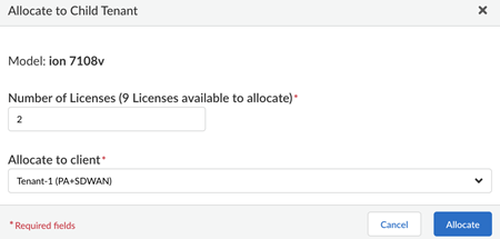 - Enter the number of device licenses to be allocated to the child tenant in Number of licenses (XX Licenses available to allocate).Choose the child tenant name from Allocate to client.Select Allocate.(Optional) View the vION device license allocation.