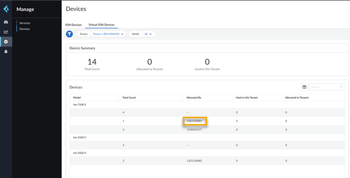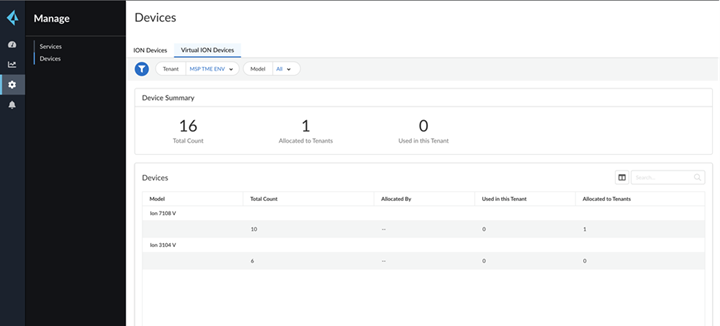 - In the parent tenant, select ManageDevices.Select Virtual ION Devices.