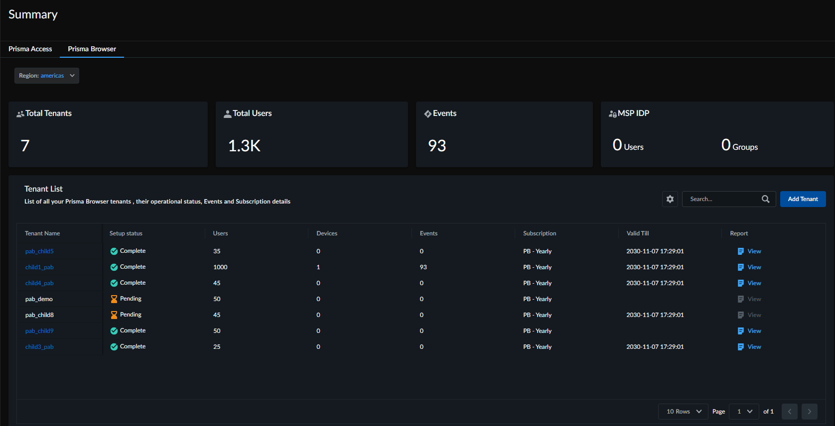 In addition, you will also see a tenants list, which is the list of child tenants and