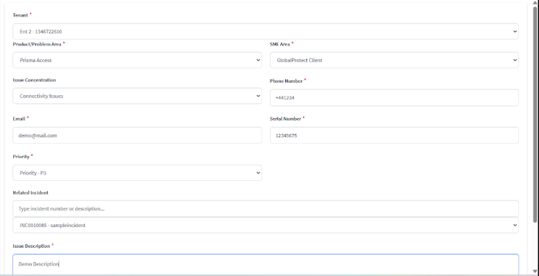 Specify all the details in the questionnaire and submit the ticket.Once submitted, tickets can be viewed under Customer Support Ticket > Tickets, where users can monitor their status and review any tickets associated with specific incidents. This correlation capability streamlines operations and ensures efficient handling of customer issues.
