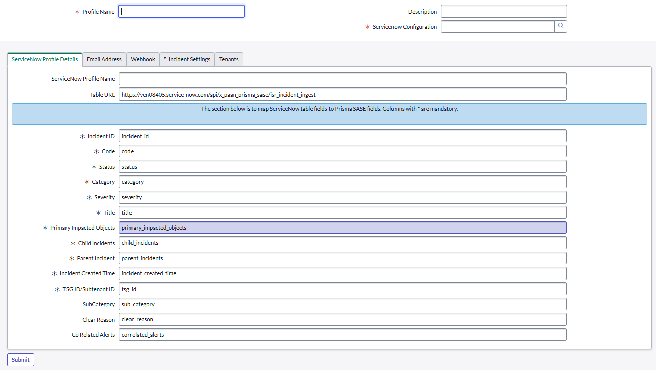 - Select Prisma SASE App for ServiceNow Incident Settings Notification Profiles New.Specify a Profile Name.For the ServiceNow Configuration, search and choose the ServiceNow Credentials that belong to this tenant.Configure the required notification methods:Select ServiceNow Profile Details to review the ServiceNow tables and Prisma SASE fields mapping, and modify them if needed.Select Email Address and specify the email to which the incident notification must be sent.Select Webhook and specify the webhook details.Webhooks are custom HTTP callbacks that you define. They are triggered by an event, such as pushing code to a repository or posting a comment on an issue. When the event occurs, the source app makes an HTTP request to the URI configured for the webhook.Select Incident Settings and configure the following to customize the incidents for which notification must be generated.