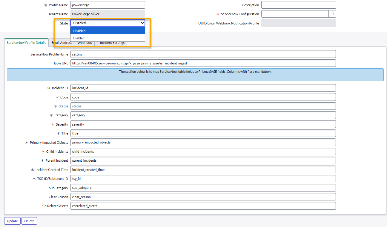 The notification profiles are disabled by default. Hence, after creating the notification, you must enable the notification profile.To enable the notification profile, perform the following:- Select Prisma SASE App for ServiceNowIncident SettingsNotification Profiles.Select the notification profile you want to enable.Select enabled from the State dropdown.Submit the updates.