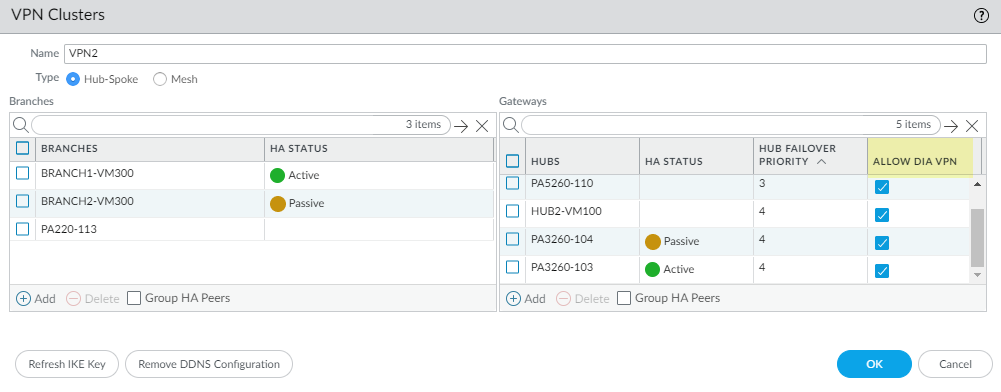 - Create a VPN cluster and select a hub.Select Allow DIA VPN for the hub. A maximum of four hubs (any combination of PAN-OS hubs participating in DIA AnyPath and Prisma Access hubs (SD-WAN plugin 2.2 and later versions)) are supported. If they are HA hubs, a total of eight hubs are supported. If you Allow DIA VPN for one HA peer in a pair, you must also enable it for the other HA peer.