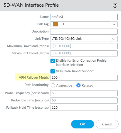 - Select or define your ISP connections and link types.Best Practice is to configure at least one interface with the link type of Ethernet, Cable modem, ADSL, Fiber, LTE, or WiFi.You must enable VPN Data Tunnel Support.Specify the VPN Failover Metric for a VPN tunnel; range is 1 to 65,535; default is 10. The lower the metric value, the higher the priority of VPN tunnel (link) where you apply this profile.For example, set the metric to a low value and apply the profile to a broadband interface; then create a different profile that sets a high metric to apply to an expensive LTE interface to ensure it is used only after broadband has failed over.If you have only one link at the hub, that link supports all of the virtual interfaces and DIA traffic. If you want to use the link types in a specific order, you must apply a Traffic Distribution profile to the hub that specifies Top Down Priority, and then order the Link Tags to specify the preferred order. If you apply a Traffic Distribution profile that instead specifies Best Available Path, the firewall will use the link, regardless of cost, to choose the best performing path to the branch. In summary, Link Tags in a Traffic Distribution profile. the Link Tag applied to a hub virtual interface (Step 6 in this task), and a VPN Failover Metric work only when the Traffic Distribution profile specifies Top Down Priority.