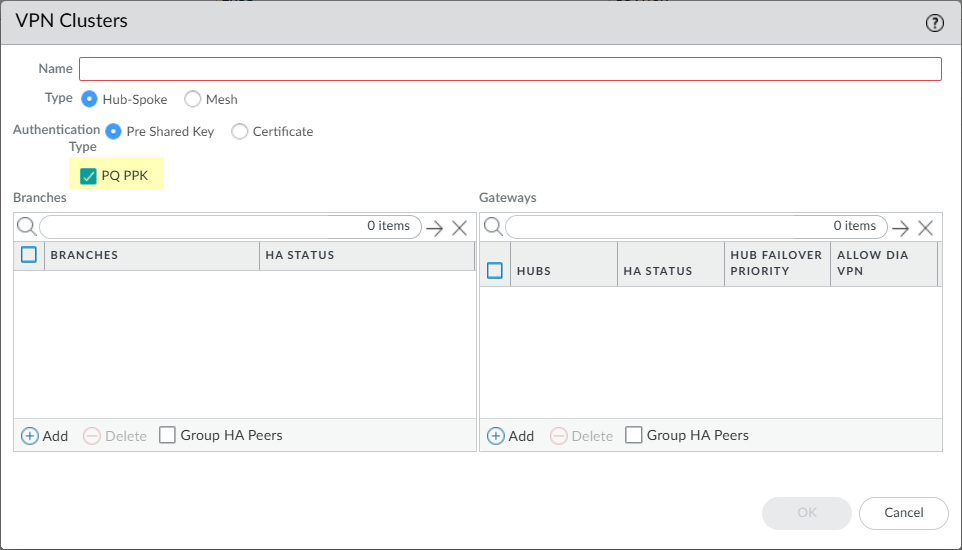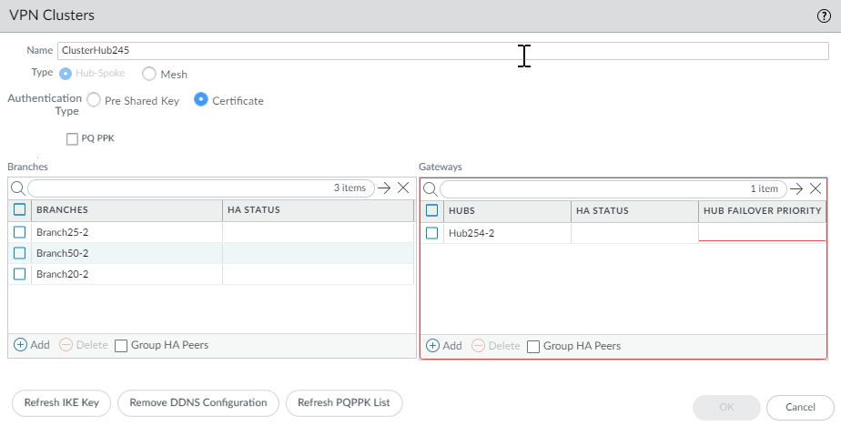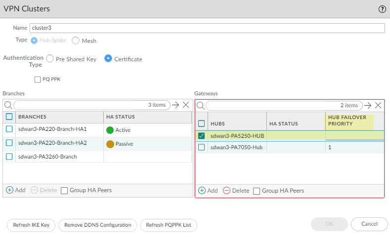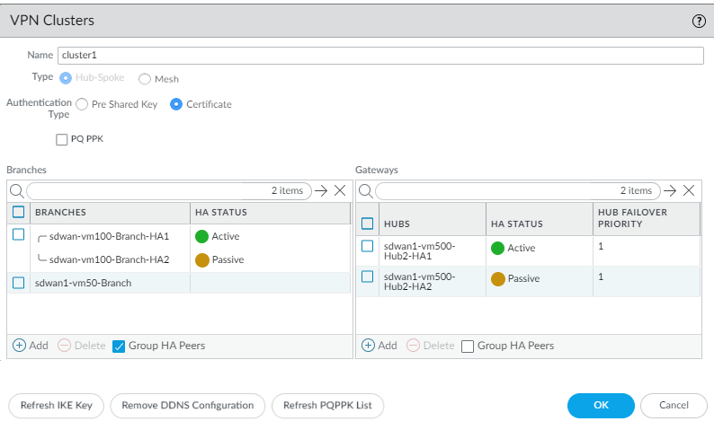 If you want to refresh the PQ PPK list, use the Refresh PQPPK List in the VPN cluster configuration. It regenerates the new post-quantum pre-shared keys and updates the keys on all SD-WAN devices within the selected VPN cluster.(HA deployments only) For Panorama in HA configuration, all PQ PPK information is synchronized between the active and passive peers, ensuring seamless failover. Similarly, for HA active/passive firewalls, the PQ PPK list and all pre-shared keys, including post-quantum key information, are synchronized between the devices. This synchronization ensures that the PQ PPK configuration remains consistent and operational across the HA pair, maintaining the quantum-safe encryption capabilities of your SD-WAN overlay even during failover events.Add one or more branch devices that you determined need to communicate with each other.- (SD-WAN
