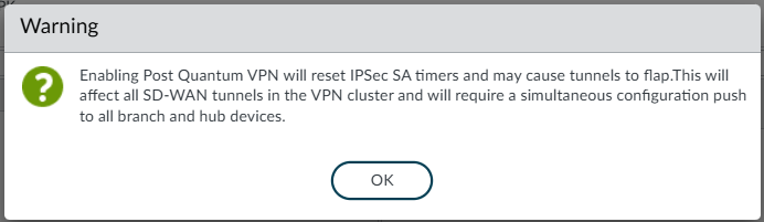 Select OK to enable post-quantum VPN for the VPN cluster. The SD-WAN plugin will automatically generate 10 strong PQ PPKs to use with the IPSec tunnels. The SD-WAN plugin will configure the IPSec tunnels to use PQ PPK with the negotiation mode set to preferred.