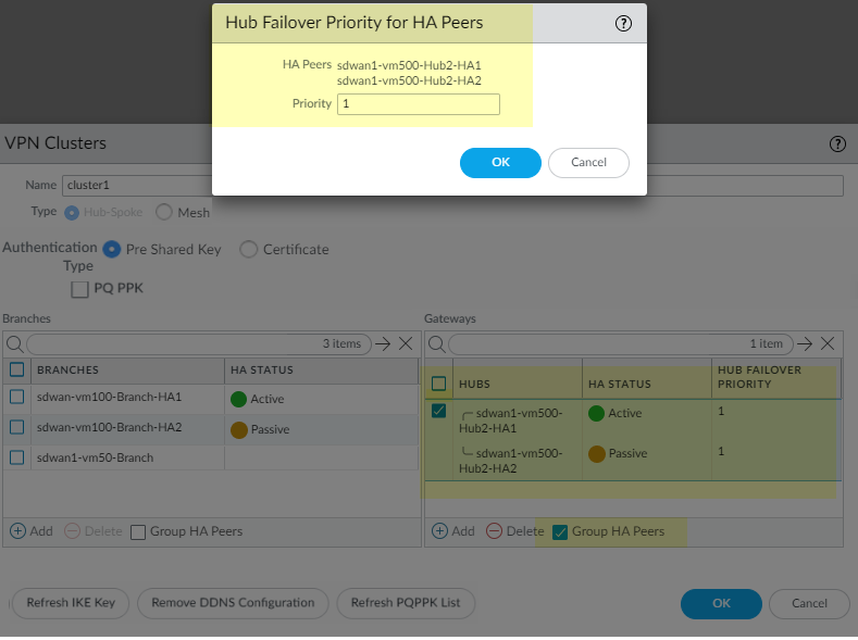OK.When configuring VPN clusters with high availability (HA) hub firewalls, both HA peers (active and passive) must be included. If you select one HA peer firewall for a hub, you're required to also select its corresponding HA peer. This ensures that both the active and passive HA peers are part of the VPN cluster configuration.