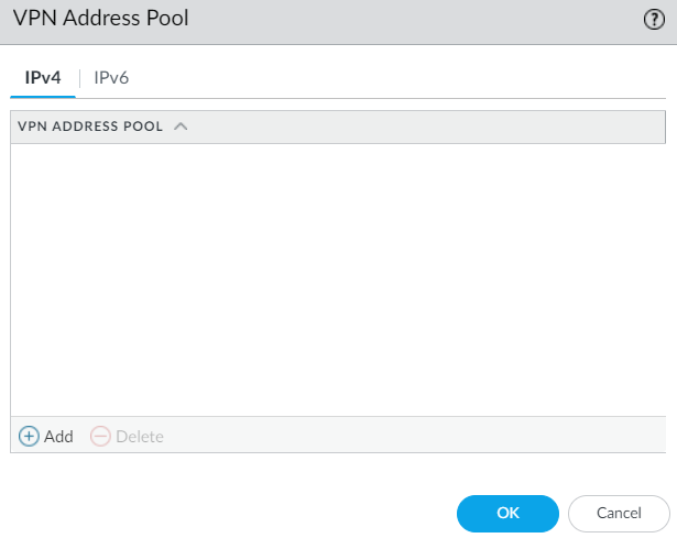 Select IPv4 or IPv6 and Add an address pool with one or more (up to 20) Member IP address and netmask ranges, for example, 192.168.0.0/16 or 2001::/16, respectively.Click OK.