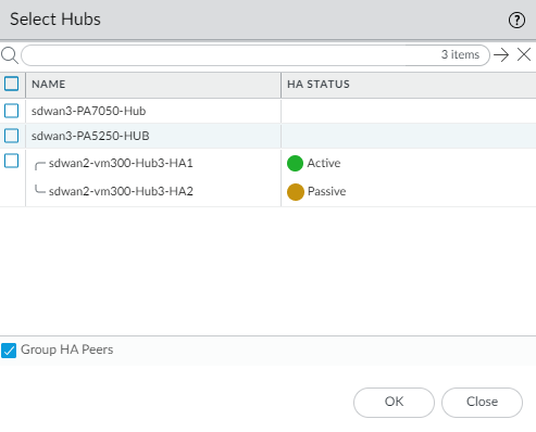 Add one or more hub devices that you determined need to communicate with the branch devices.SD-WAN hubs in an HA configuration are considered as a single SD-WAN hub firewall.MPLS and satellite link types will form tunnels with only the same link type; for example, MPLS-to-MPLS and satellite-to-satellite. Tunnels won’t be created between an MPLS link and an Ethernet link, for example.For the SD-WAN versions earlier than 3.1.3, you can add up to four SD-WAN hub firewalls to a VPN cluster.(SD-WAN plugin 3.2.1 and later versions) You can add up to 16 SD-WAN hub firewalls to a VPN cluster. Only four of the 16 hubs can have the same hub priority within a VPN cluster due to ECMP. Any attempt to configure the same priority for more than four SD-WAN hubs would result in a commit error.- (SD-WAN plugin 1.0.1 and later versions) Select Group HA Peers to display the hub devices that are HA peers together.