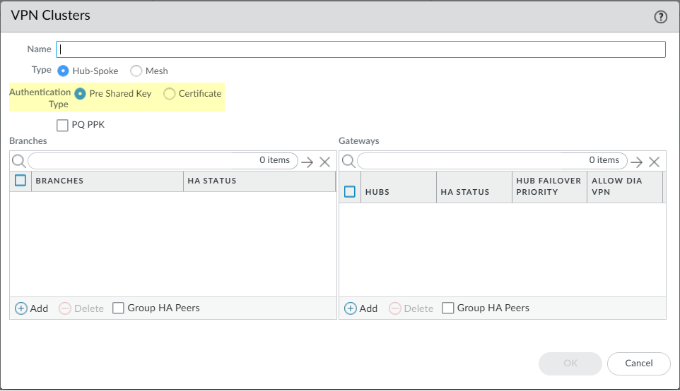- When multiple VPN clusters with PQ PPK share a hub firewall, then the shared hub firewall cannot simultaneously support some clusters with PQ PPK enabled and others using standard PSK authentication. That is, all VPN clusters connected to a shared hub firewall must either use PSK or use PQ PPK.