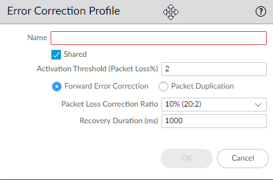 - Select Network PoliciesSD-WAN PolicyProfilesError Correction.To make the Error Correction profile available to all SD-WAN firewalls regardless of folder association, select All Firewalls.Add Profile.Enter a descriptive Name.Specify the Activation Threshold (Packet Loss %) to set the packet loss percentage that must be exceeded before error correction is activated.Select the error correction Mode.Only a single error correction Mode can be selected for an Error Correction profile.(Forward Error Correction only) Select the Packet Loss Correction Ratio to specify the ratio of parity bits to data packets.The higher the ratio of parity bits to data packets that the sending firewall sends, the higher the probability that the receiving firewall can repair packet loss. However, a higher ratio requires more redundancy and therefore more bandwidth overhead, which is a tradeoff for achieving error correction. The parity ratio applies to the receiving firewall’s outgoing traffic.Also specify the Recovery Duration (ms) to set the maximum number of milliseconds that the receiving firewall can spend performing packet recovery on last data packets using the parity packets it received.Save.