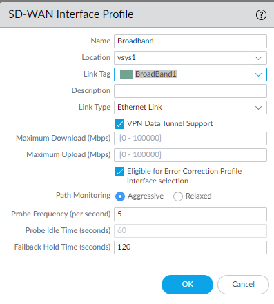 - Log in to the Panorama Web Interface.Define your ISP connections and link types, where you select Eligible for Error Correction Profile interface selection to indicate that the firewall can automatically use the interfaces (where the SD-WAN Interface Profile is applied) for error correction. Whether this option defaults to selected or not depends on the Link Type you select for the profile.You can have Eligible for Error Correction Profile interface selection unchecked in a profile and apply the profile to an expensive 5G LTE link, for example, so that costly error correction is never performed on that link.