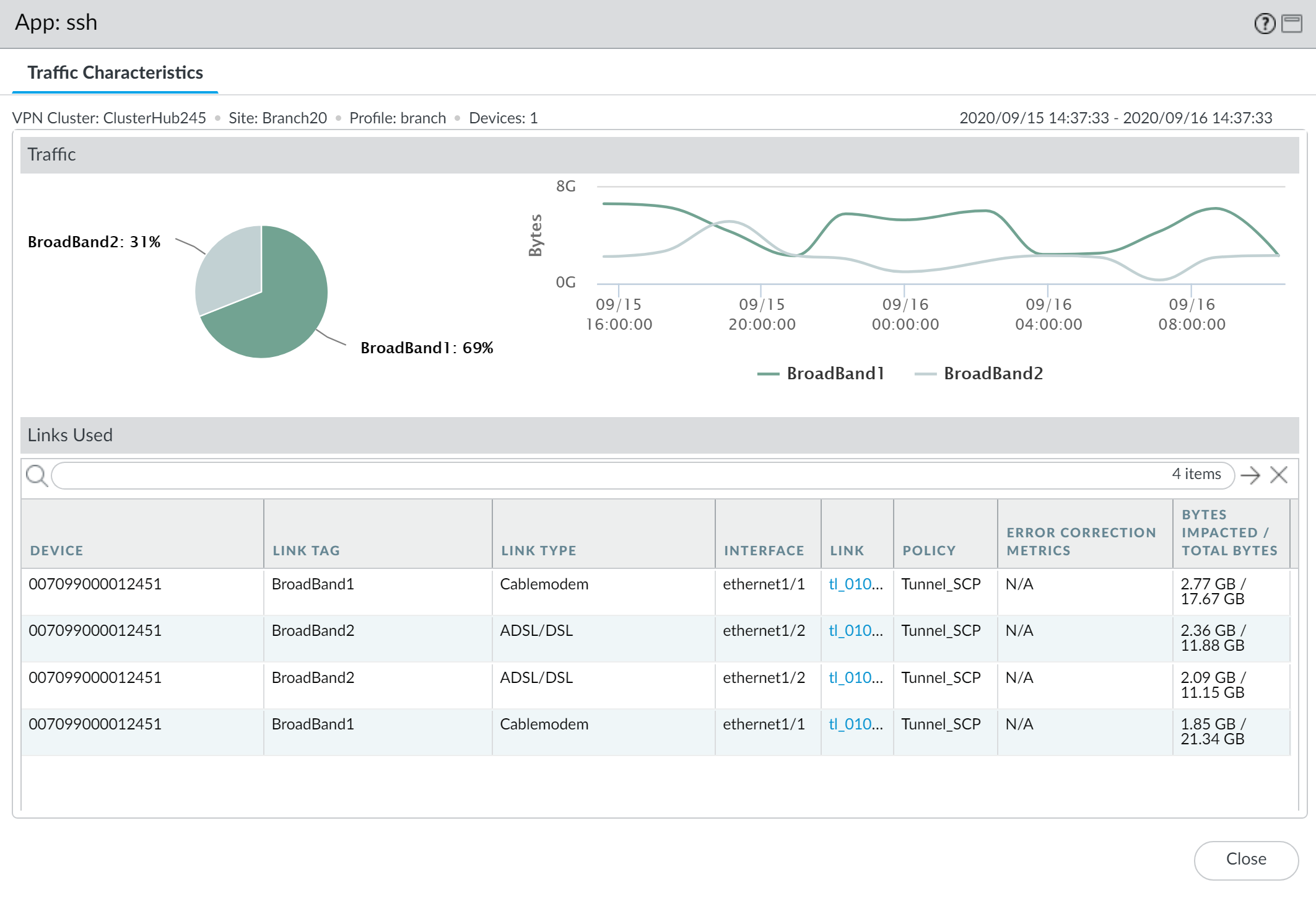 - Review the Links Used section to understand which links the app traffic used and to understand how many of the bytes were impacted out of the total bytes in the selected time frame.
