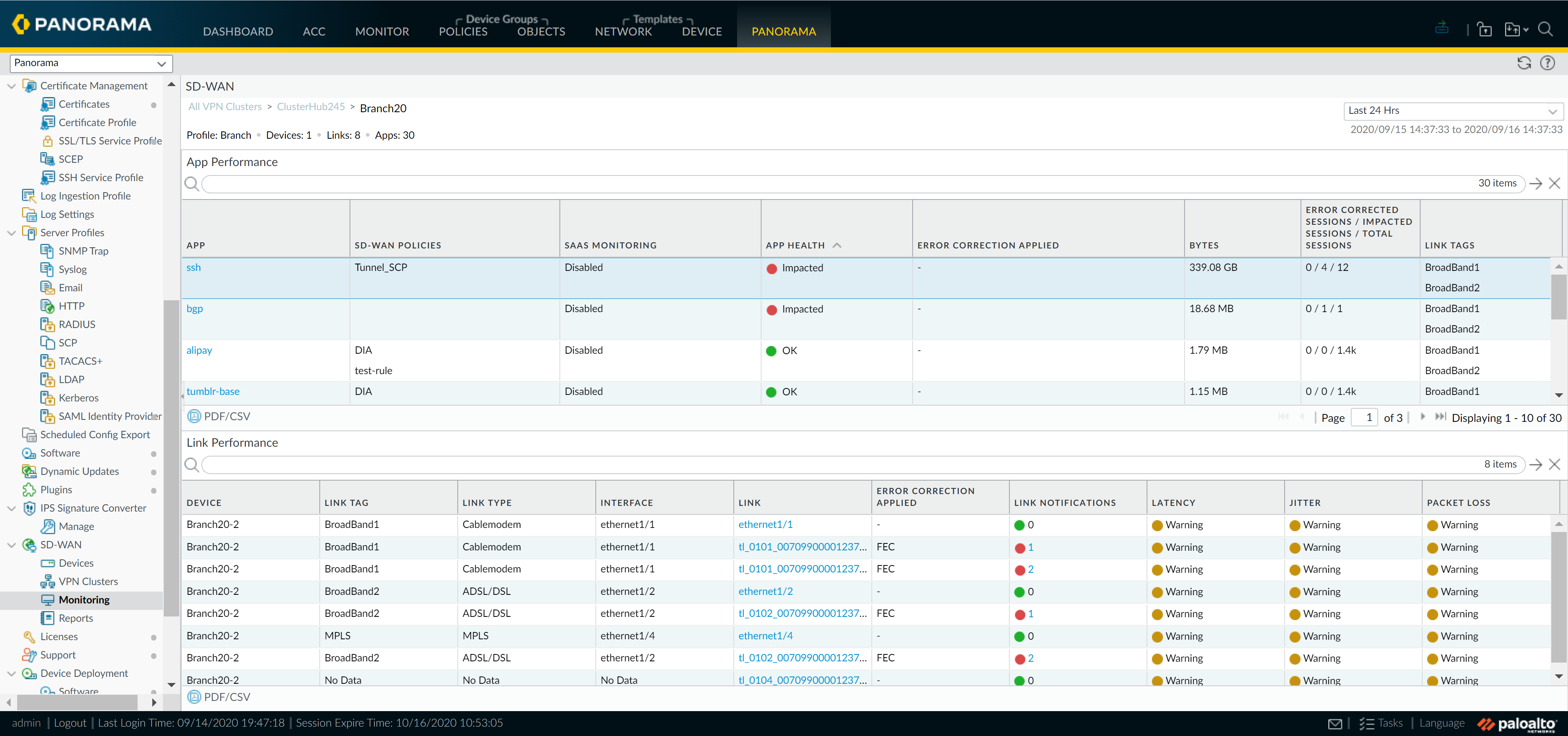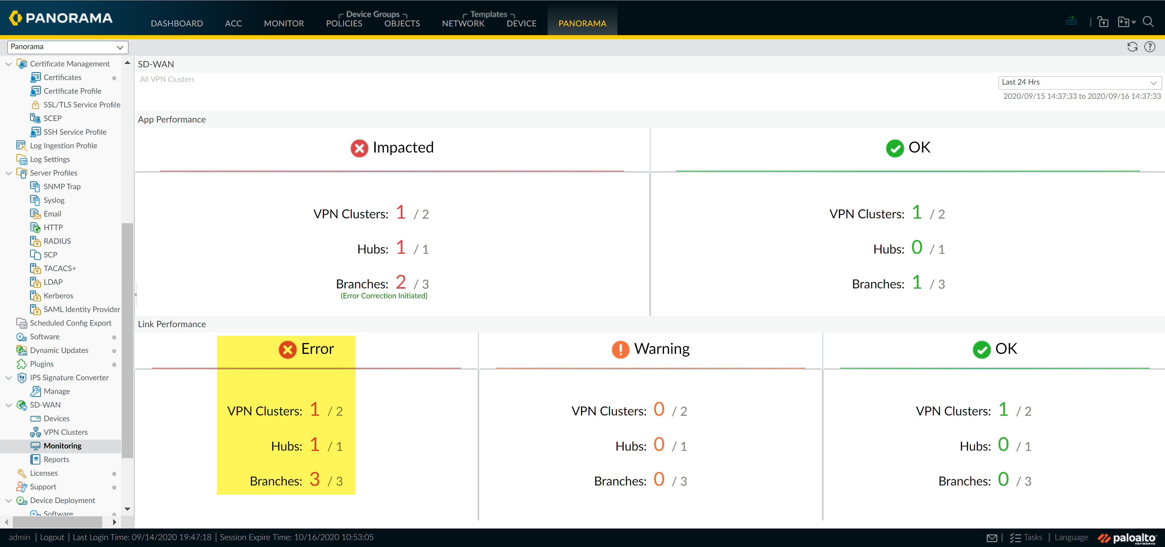 - Log in to the Panorama Web Interface.Select PanoramaSD-WANMonitoring and view the Impacted VPN clusters.