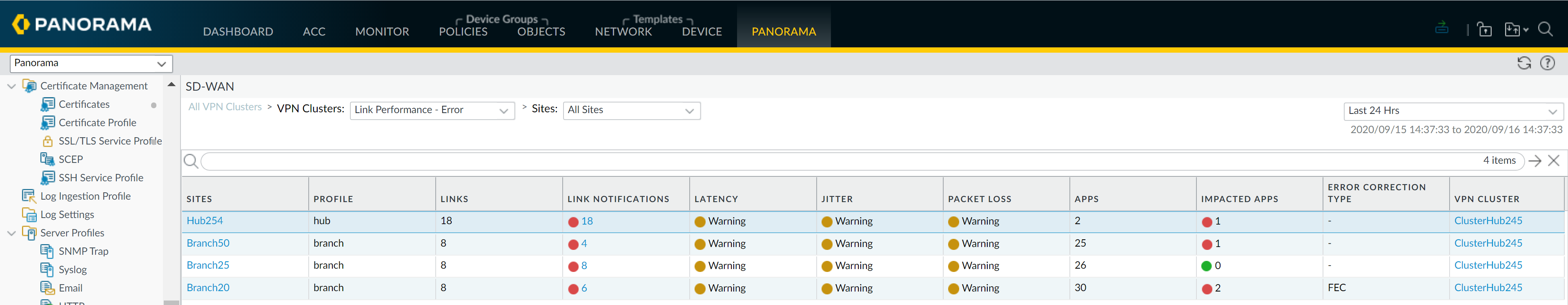 Filter the VPN clusters based on your preferred metric from the Site drop-down and select time frame. In the Sites column, select the impacted hub or branch firewall to view the impacted apps and the corresponding link performance.In this example, we are viewing All Sites containing impacted VPN clusters in the last 24 hours.