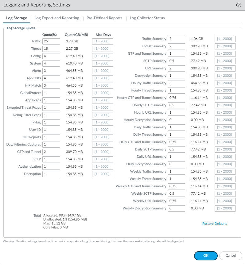 - (Optional) Next to the quota is the Max Days that the firewall keeps SCTP logs. The maximum number of days is unlimited by default, but you can enter a limit for the number of days (range is 1 to 2,000).