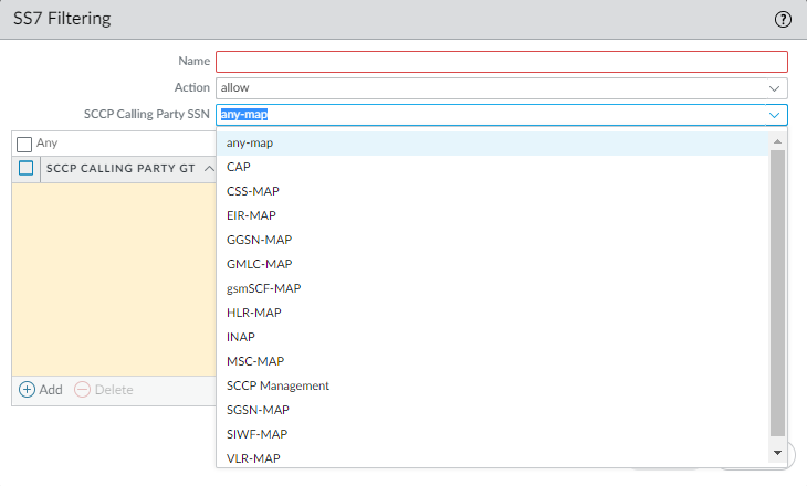 The firewall does not apply SS7 filtering to Data chunks that an endpoint has fragmented. - Select an SCCP Calling Party SSN entry