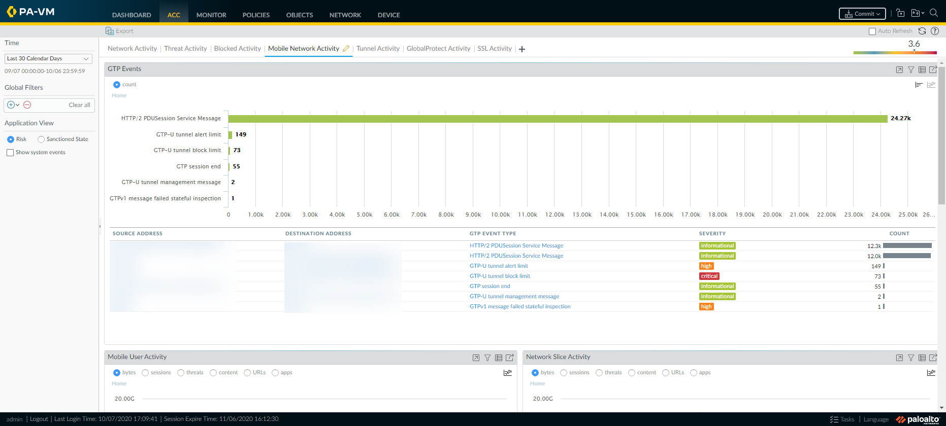 The Mobile Network Activity tab on the Application Command Center (ACC) includes widgets that visually represent GTP log data. The interactive widgets allow you to set the ACC filters and drill down into the details for each table or graph, or customize the widgets included in the tab to focus on the information you need.