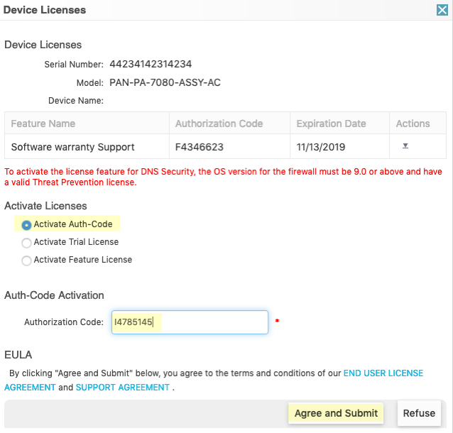 The Device Licenses screen appears. Enter the Auth Code from your sales order into the Authorization Code field. Select Activate Auth-Code.Select Agree and Submit.