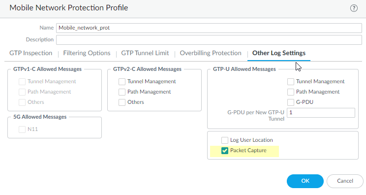 - Select ObjectsSecurity ProfilesMobile Network Protection and select an existing profile or Add a new profile.Select GTP InspectionGTP-C and enable either GTPv2-C Stateful Inspection or GTPv1-C Stateful Inspection to enable the Mobile Network Protection profile.Select Other Log Settings and enable Packet Capture.