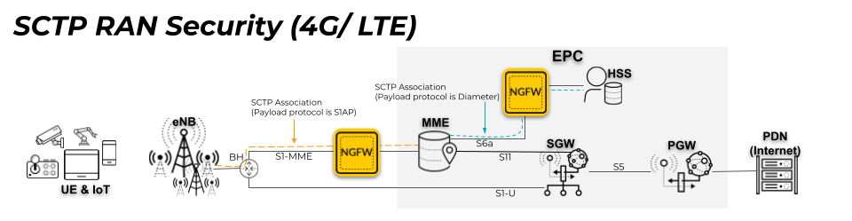 - In the case of the firewall located between the HSS and MME (orange dashed connection), the protocol in use is Diameter-3GPP-S6a over SCTP.