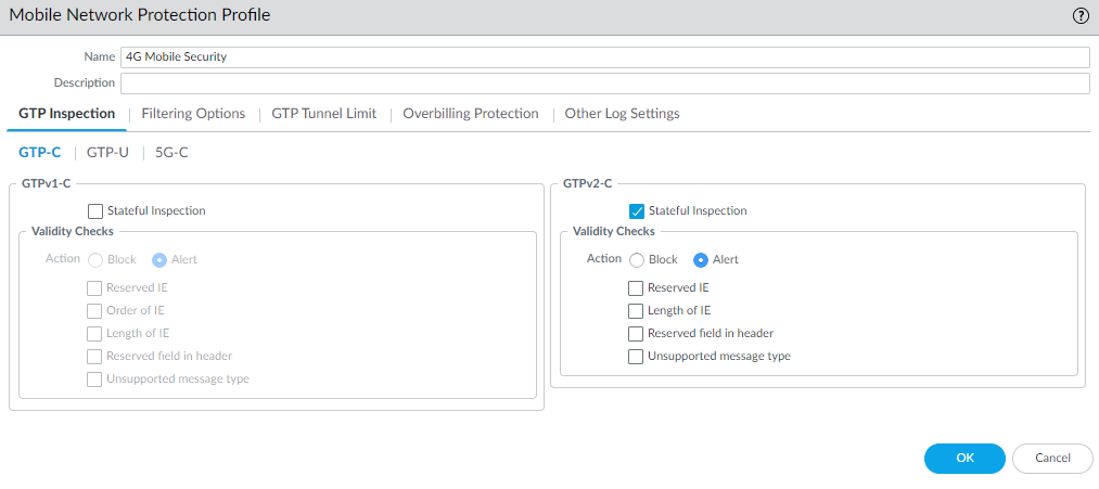 - Select ObjectsSecurity ProfilesMobile Network Protection.Add a profile by Name, for example, 4G Mobile security.Enter a Description.On the GTP Inspection tab, select GTP-C.Enable GTPv2-C Stateful Inspection to enable inspection of GTPv2 control packets.