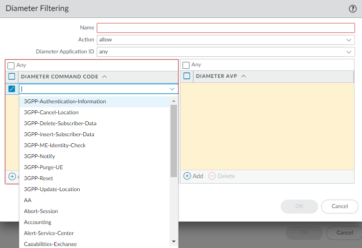 Select Diameter Filtering to apply granular-level filtering on Diameter applications and their messages.- Add a Diameter filter by Name using a maximum of 20 characters—numbers, uppercase and lowercase letters, periods, hyphens, and underscores.Specify the Action the firewall takes on a chunk that includes any of the specified Diameter application IDs, command codes, or attribute-value pair (AVP) codes:
