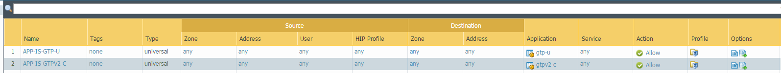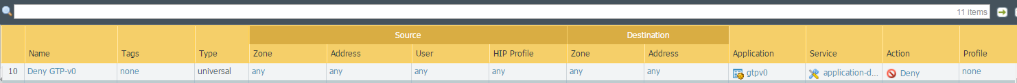 - >set gtp nodrop yesThe firewall continues to perform GTP stateful inspection and generate logs, but won’t drop GTPv2, GTPv1-C, or GTP-U packets that fail GTP stateful inspection. When you later decide to re-enable the firewall to drop packets that fail GTP stateful inspection, use the CLI operational command: set gtp nodrop no (this is the default setting).