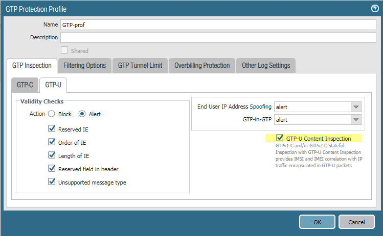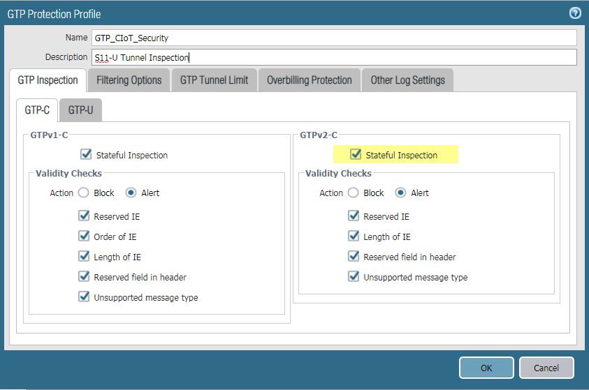 To protect your mobile network and CIoT traffic that use 3rd Generation Partnership Project (3GPP) technologies, follow the procedure to configure GTPv2-C Stateful Inspection to statefully inspect the S11-U tunnels. Create a GTP Protection Profile and enable GTP-U Content Inspection to inspect the content of the GTP-U traffic inside the S11-U tunnels. Attach the profile to a Security policy rule (that identifies the application, such as gtpv2-c and gtp-u) and apply the rule to zones for network elements that use GTP, such as between an MME and SGW.