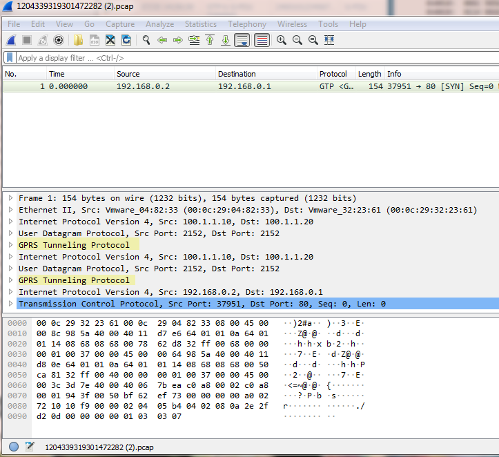Get a packet capture of a GTP event, such as GTP-in-GTP,