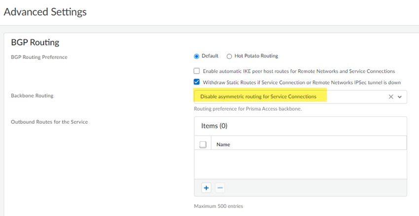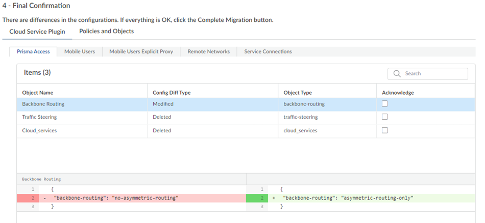 (Optional) Make changes to the diffs.Any changes you make are not committed to your configuration until you complete the migration and push your changes to Strata Cloud Manager.- Navigate to the area in the Prisma Access configuration where you found the diffs and make changes to the configuration.For the example in the previous step, the migration program made a change to Backbone Routing (from no-asymmetric-routing to asymmetric-routing-only). To change this setting back to your original configuration, go to WorkflowsPrisma Access SetupService ConnectionsAdvanced Settings ConfigurationNGFW and Prisma AccessConfiguration ScopePrisma AccessService ConnectionsAdvanced Settings and change the Backbone Routing configuration to Disable Asymmetric Routing for Service Connections.
