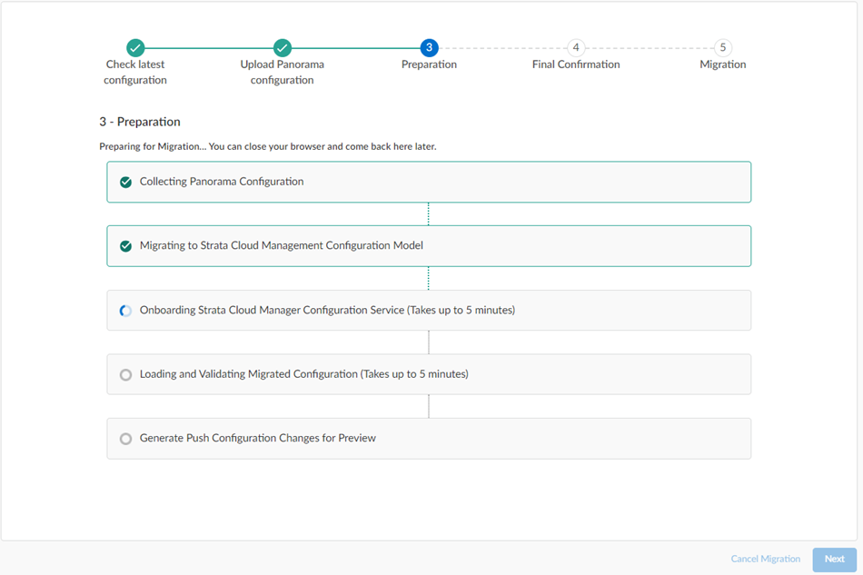 Click Next: Prepare Migration.The migration process begins.Wait for all steps to be completed.If there are any issues with the migration, return to the previous steps to evaluate and make changes. If issues continue to persist, please contact Palo Alto Networks Support.Prepare to migrate.- Load Configuration to Strata Cloud Manager to prepare to migrate.