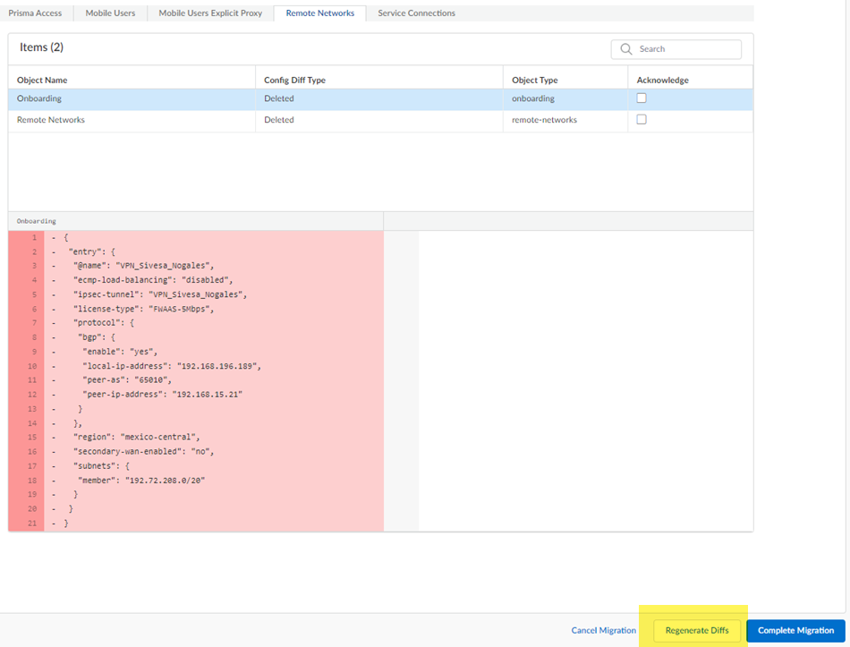 If the migration program made changes, review them in the final confirmation screen.The migration program might make changes to your configuration to account for differences in the Panorama and the Strata Cloud Manager configuration or to fix unsupported functionality. If changes are required, the migration program shows those changes in a diff view with the new lines in green and the deleted lines in red.Ignore any diffs that show the following object names; they don't affect your configuration:- Clientless-vpn crypto-settings