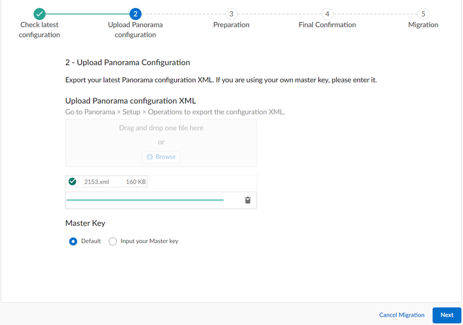 - Select the Panorama configuration .xml file you downloaded in an earlier step by dragging and dropping it from your file explorer or selecting Choose File.(Optional) Input your Master Key or, if you did not create a custom master key, use the Default one.